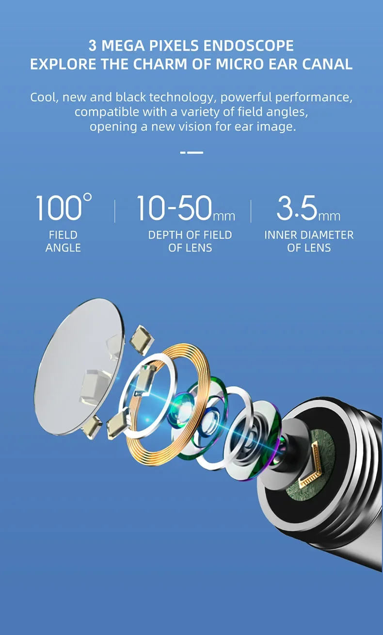 Use optical lens and high performance 300W pixel. The CMOS sensor has a clear picture, 20X amplifying ear canal & 100° viewing angle. 13 lens combination & 6 LED lights. IP67 waterproof lens. Water washable(Not hot water). Adapt to dry ear, oil ear and other complex environment.