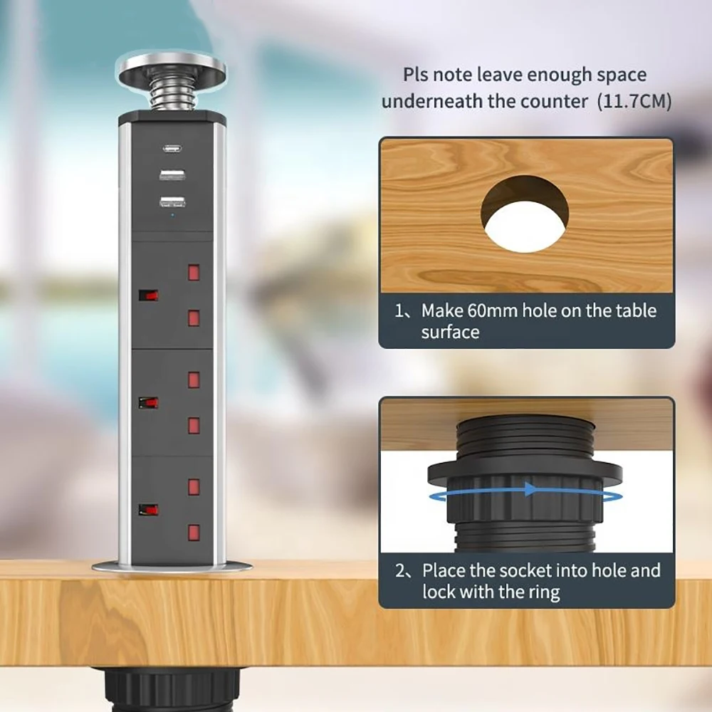Melery UK Pop Up Socket Hidden Table Electrical Plug USB Type-C Power Strips Wired Extension for Home Desk Office Kitchen