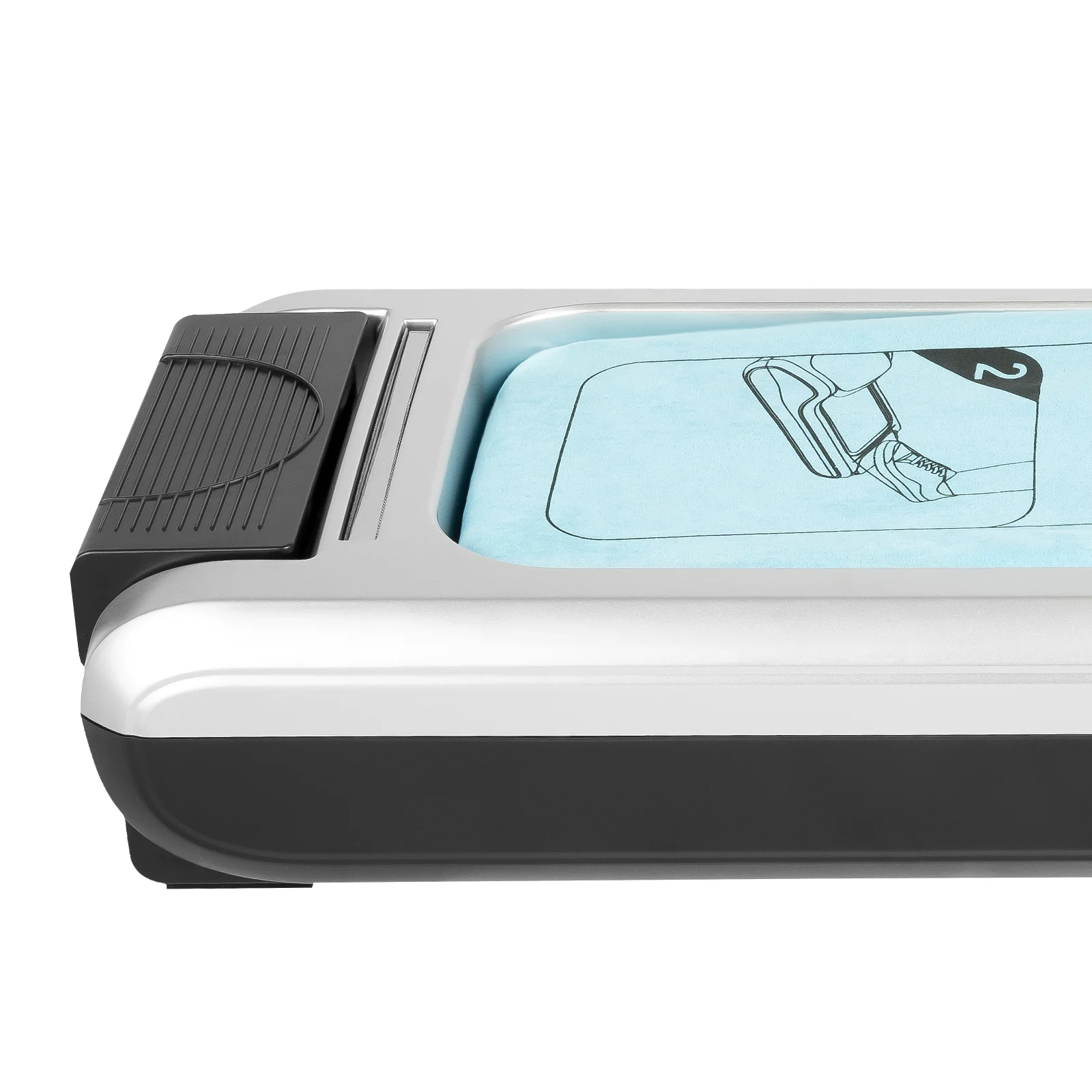 This hands-free dispenser automatically wraps your shoes with protective film — no bending, no hassle.