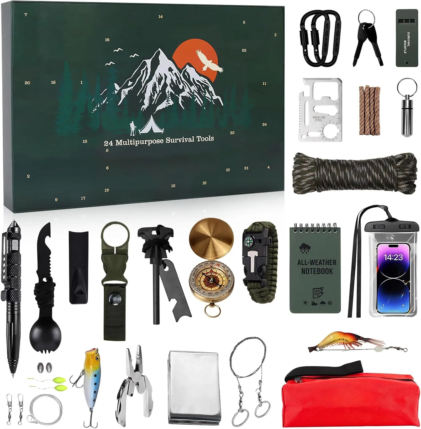 Make every day an adventure with this 24-Day Survival Kit Countdown Calendar — packed with weatherproof metal tools and essential emergency gear for outdoor lovers. Each numbered window reveals a new multipurpose survival item, including fire starters, knives, rope tools, safety gear, repair tools, and more. Perfect as a holiday gift for campers, hikers, travelers, and preparedness enthusiasts, this kit blends excitement with real-world utility. Durable, practical, and thoughtfully curated, it’s a fun and functional way to gear up for the outdoors.